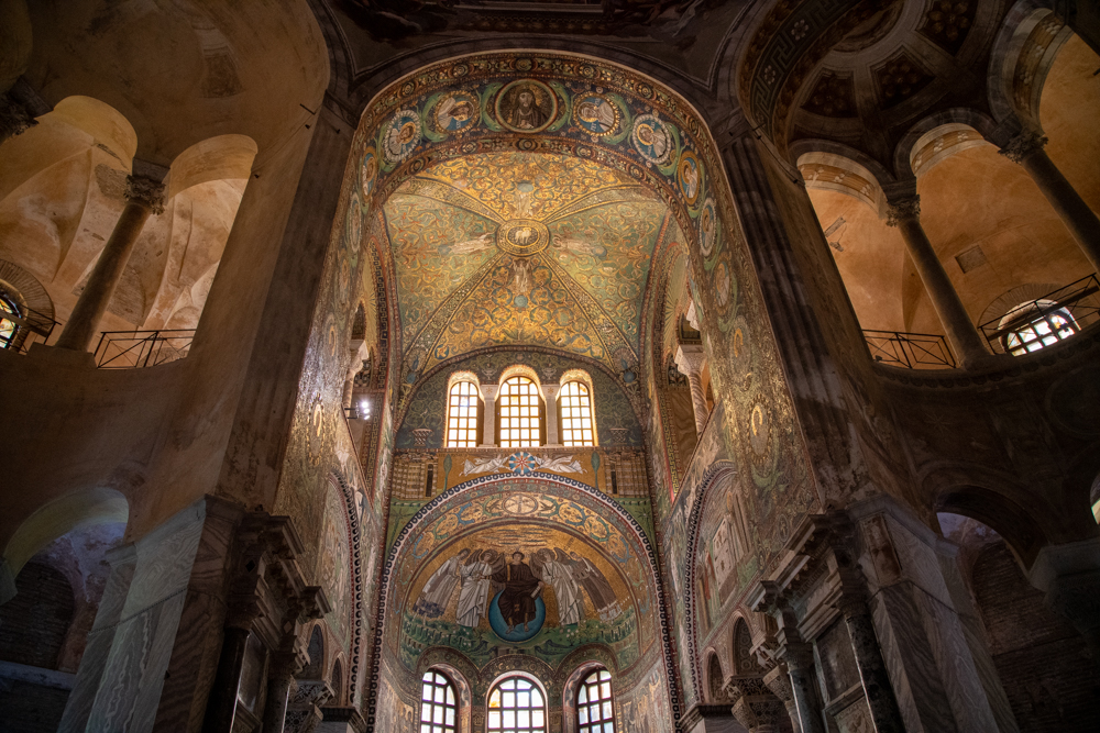Il Mausoleo di Galla Placidia, di piccole dimensioni, ma ricoperto all’interno da una preziosa e suggestiva decorazione musiva su un fondo blu notte, appartiene alla tradizione dell’architettura latina d’Occidente. Il Battistero Neoniano, splendente di tarsie marmoree, di stucchi e mosaici policromi nella cupola, costituisce un esempio raffinato e perfettamente conservato di battistero paleocristiano. Del periodo più fulgido del regno dei Goti, il Battistero degli Ariani, conserva mosaici che rappresentano il battesimo di Cristo, e particolarità iconografiche che riflettono i principi di fede ariana. Sempre sotto il regno di Teodorico venne costruita la Basilica di Sant’Apollinare Nuovo, con funzione di cappella palatina, i cui mosaici appartengono alla tradizione stilistica romana e allo stesso tempo mostrano il forte influsso bizantino. Il Mausoleo di Teodorico è un episodio architettonico unico e irripetibile: costruito con grandi blocchi di pietra d’Istria, a pianta centrale, è l’unico esempio superstite rimasto di una tomba di re barbarico di questo periodo. La Cappella Arcivescovile, invece, è l’unico monumento ortodosso fatto costruire durante il regno di Teodorico. La Basilica di San Vitale, di età giustinianea, è una delle massime realizzazioni dell’architettura bizantina in Italia, e concentra in sé elementi di tradizione occidentale e orientale. Infine, a 5 chilometri da Ravenna si innalza la Basilica di Sant’Apollinare in Classe, che si impone per le sue grandiose forme basilicali, il campanile cilindrico, la spazialità dell’interno, la ricchezza dei marmi e dei mosaici.