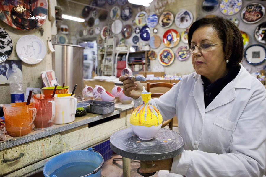 Il Calligrafico naturalistico che s’ispira alle porcellane cinesi, il Bianco e Blu Savona con castelli e figure mitologiche che campeggiano nei loro profili di colore acceso su uno sfondo bianco o azzurrino. E poi il Levantino, l’Art Déco, il Boselli e la Ceramica Futurista, abile nel plasmare con forme capricciose ed eccentriche la duttile materia. Sono davvero tanti gli stili e i decori della produzione ceramica di Albisola Superiore e Albissola Marina, due comuni separati da un ponte ma uniti dai colori vivaci della maiolica che invadono vie, muri e il bellissimo lungomare. Il percorso comincia ad Albisola Superiore, nella casa-laboratorio dell’artista Manlio Trucco, oggi museo: un compendio della tradizione ceramica albisolese dal Medioevo al Novecento che si apprezza di sala in sala tra pitture, sculture e corredi ceramici e continua sulla Passeggiata Eugenio Montale, dove si cammina sul tracciato della ex ferrovia abbagliati dal caleidoscopio di forme e colori di opere ceramiche contemporanee che emergono sullo sfondo di palme, mare e ulivi. Sino ad arrivare ad Albissola Marina e agli incantevoli mosaici in ceramica che compongono il celeberrimo Lungomare degli Artisti, realizzato con milioni di tessere di vetro-ceramica multicolore. Nella dimora-atelier dell’artista danese Asger Jorn si rimane stupiti da come i confini tra architettura, natura e arti decorative sfumino pian piano per divenire una cosa sola, mentre nel Centro Esposizioni MuDA e nelle Fabbriche-Museo “Giuseppe Mazzotti” e “San Giorgio” le opere di Fontana, Lam, Fabbri, Luzzati, Crippa, Jorn, Baj mostrano come la cooperazione tra i maestri ceramisti albisolesi e gli artisti del secondo Novecento abbia creato un repertorio fantastico di stili e figure capace di dispiegare le ali alla poesia.