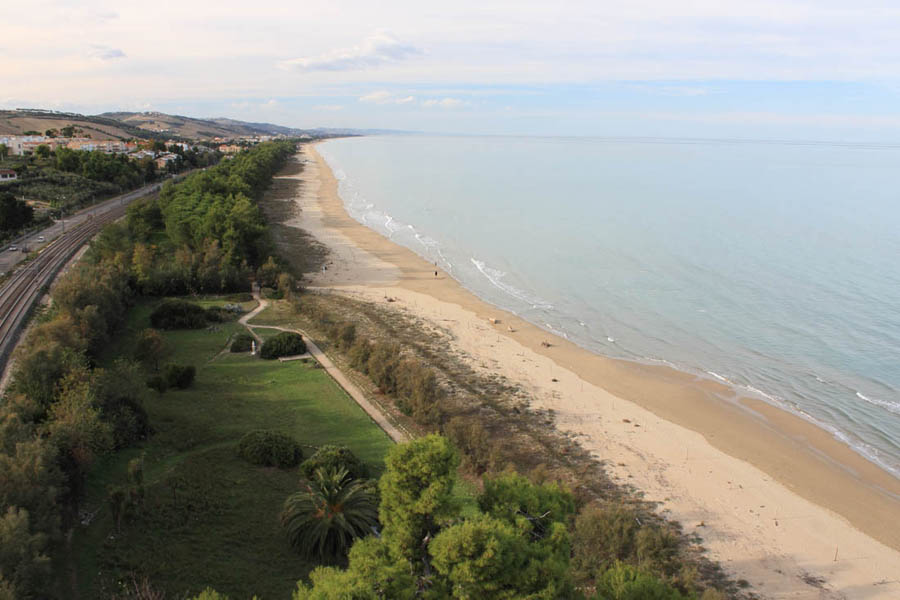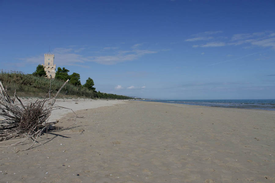 Il percorso sinuoso della strada nasconde alla vista la torre del Cerrano fino a qualche centinaio di metri prima. Le si passa accanto in cima al piccolo promontorio mentre per un istante si rivede il mare e, poco dopo, si parcheggia per raggiungerla a piedi in fondo alla ciclopedonale che corre tra la ferrovia e la spiaggia. Oltre il cancello si percorre il vialetto che sale all’ampia terrazza sul mare da cui la torre s’innalza in tutta la sua eleganza. Negli ultimi tre piani dell’edificio si visita il Museo del Mare, che espone le specie più rare che popolano i fondali di questo tratto di Adriatico, protetto dall’Area marina a cui la torre dà il nome e che si estende fino a 3 miglia nautiche dal litorale e per 7 km lungo la costa. Infine, si sale in cima per godere la splendida vista del litorale bordato dalle colline coperte da vigne e uliveti e coronate da antichi abitati. Ai piedi della torre, un cannone, ricordo dei trascorsi militari dell’ultimo residente, segna l’inizio del percorso nel Giardino Mediterraneo che termina nell’estesa pineta litoranea. Dal giardino si scende in spiaggia attraversando un brevissimo tratto dove la vegetazione spontanea favorisce la formazione di piccole dune. Questo lembo selvaggio è il luogo dove a primavera si può osservare il fratino (Charadrius alexandrinus), un piccolo, grazioso e raro uccello che ogni anno vi nidifica. A riva si notano lunghi scogli che emergono dalla sabbia e s’inoltrano in acqua: sono i resti dell’antico porto di Hatria, l’odierna Atri, le cui parti sommerse si possono esplorare un po’ al largo nuotando a pelo d’acqua. I massi a riva, più o meno affioranti a seconda delle stagioni, offrono un comodo appoggio per chi vuole prendere il sole e sono l’abituale punto di sosta di lunghe e rilassanti passeggiate verso la suggestiva torre solitaria il cui profilo si staglia contro il cielo.