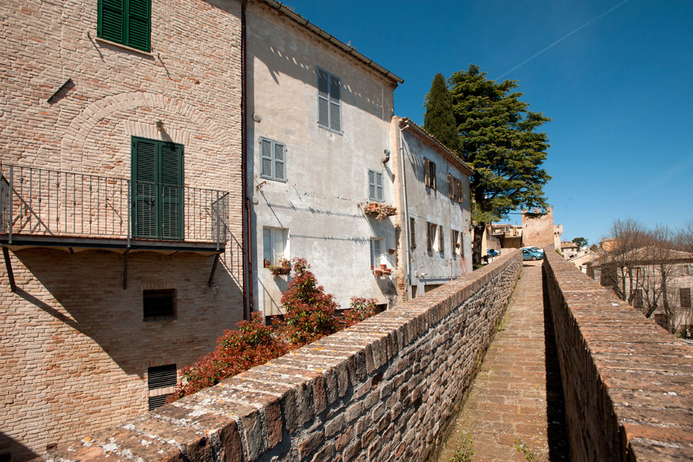 Muraglie di mattoni rossi si staccano dal verde dei colli che digradano verso il mare, tracce della forza militare del passato che segnano questo tratto dell’entroterra marchigiano. Alle architetture militari è dedicato il viaggio che inizia dal centro di Senigallia, dominato dalla mole della Rocca, fulcro del potere dei Della Rovere. Ci si sposta poi verso altre fortificazioni del passato. Si ammira Ostra, abbracciata da una cinta muraria e da nove torrioni che disegnano il paesaggio, prima di raggiungere Corinaldo, da ammirare dall’alto percorrendo porte fortificate e camminamenti di ronda delle sue mura quattrocentesche. Dopo una sosta alla città romana di Suasa e a San Lorenzo in Campo, si prosegue verso Mondavio per scoprirne l’imponente Rocca, capolavoro di architettura rinascimentale cui Francesco di Giorgio Martini diede la forma suggestiva di una balestra. Ancora pochi chilometri per arrivare a Mondolfo e guadagnare la sommità della sua cinta muraria da cui ammirare i colori dell’Adriatico, segnato a meridione dalla mole del Monte Conero.