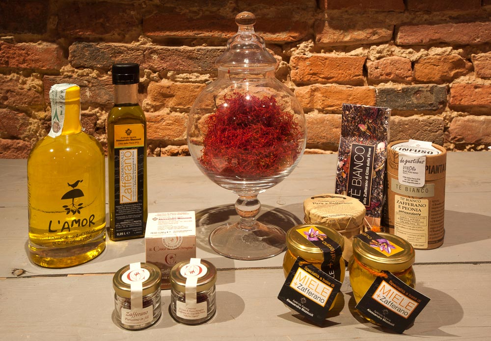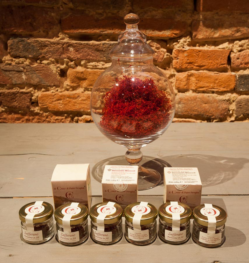 Nel Medioevo e nel Rinascimento, attorno a Città della Pieve lo zafferano costituiva una vera ricchezza, e i mercanti sostavano tra le mura della cittadina per acquistare la spezia dorata. All’epoca, però, lo zafferano non aveva un uso culinario, ma era preziosissimo per tingere stoffe e panni, oppure per realizzare i colori gialli e dorati brillanti utilizzati dai grandi pittori. Pietro Vannucci, detto il Perugino, nacque proprio qui alla metà del Quattrocento, e in città si trovano alcuni suoi splendidi dipinti, come l’Adorazione dei Magi, affresco conservato nell’Oratorio di Santa Maria dei Bianchi, la Deposizione dalla Croce che orna una cappella della ex Chiesa di Santa Maria dei Servi, oppure il Battesimo di Cristo e la Madonna in Gloria, conservati nella Cattedrale. Oggi lo zafferano è invece una spezia rara e preziosa, e il Consorzio “Il croco di Pietro Perugino-Zafferano di Città della Pieve” raccoglie più di trenta produttori della mitica spezia, che la commercializzano pura – condimento molto particolare e aromatico – oppure preparano, proprio con lo zafferano, miele e infusi, liquori e biscotti dal sapore inconfondibile.