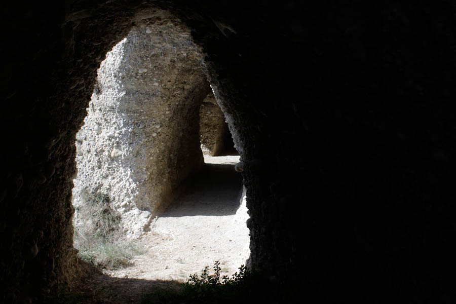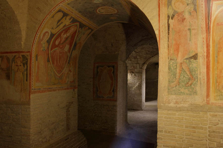 L’avvincente visita del sottosuolo della città di Atri inizia scendendo i gradini che portano nei sotterranei del Palazzo dei Duchi d’Acquaviva. Osservati da una Natività seicentesca, si entra in una lunga sala con pavimento selciato in pendenza verso un pozzo e poi in ambienti più vasti con volte altissime. Sono le scuderie ducali, utilizzate anche come prigioni e luoghi di tortura, ricavate nel Cinquecento da un’enorme cisterna romana e ora affascinanti spazi per mostre d’arte. La cisterna era collegata a una imponente rete idrica di cui, fuori le mura, è possibile vedere una delle ramificazioni più interessanti, le cosiddette “grotte”, ovvero un suggestivo dedalo di gallerie scavate nel conglomerato di ciottoli, caratterizzate da profilo regolare, fondo liscio e ampie tracce d’intonaco alle pareti, chiaro indizio della loro funzione idraulica. Si torna in centro città per entrare nella Cattedrale, con i suoi magnifici affreschi che si riflettono nel pavimento di vetro attraverso cui, tra i resti di un edificio romano che alcuni ritengono terme e altri la pescheria del mercato, si ammirano splendidi mosaici a tema marino. Attraverso la sagrestia si passa nel grande chiostro da cui si scende nella cripta, un ambiente solenne delimitato da possenti mura in blocchi squadrati e ripartito da grandi pilastri che sorreggono le volte a crociera, reso ancora più suggestivo dai tanti affreschi del XIV e XV secolo e da un enigmatico sarcofago in mattoni. Pochi passi dividono la Cattedrale dal teatro romano di età augustea. Scesi al suo interno, si nota che l’edificio attiguo (Palazzo Cicada) poggia sui resti della cavea superiore, ben visibili nel seminterrato del palazzo stesso, e si scoprono imbocchi di altri cunicoli, per ora non visitabili.