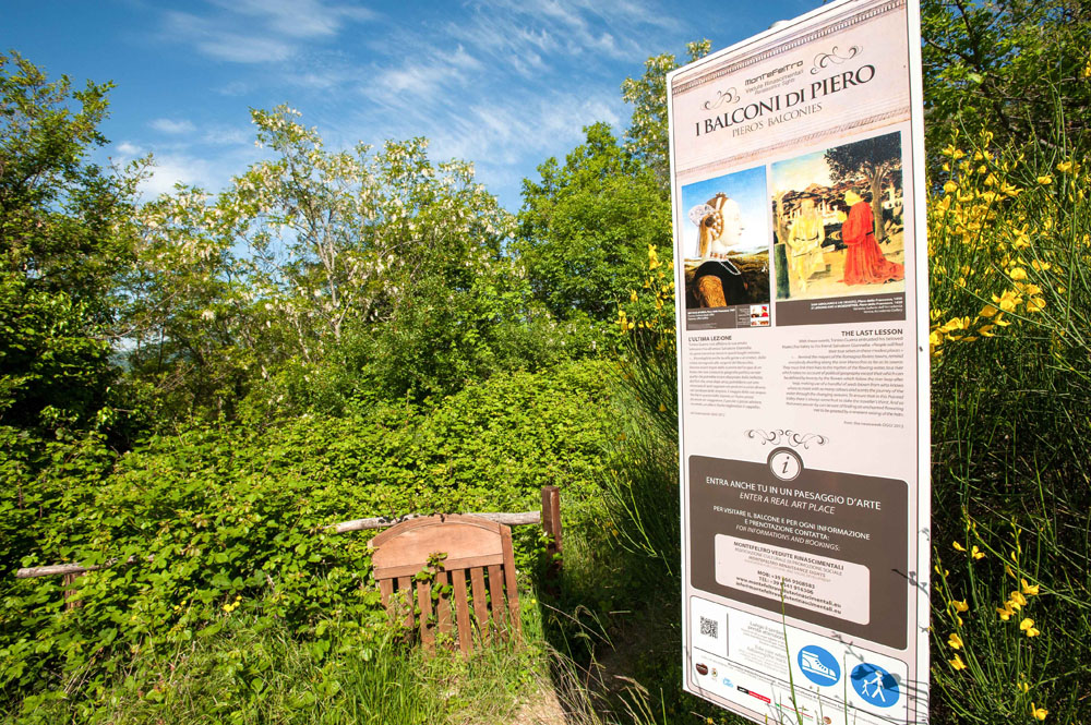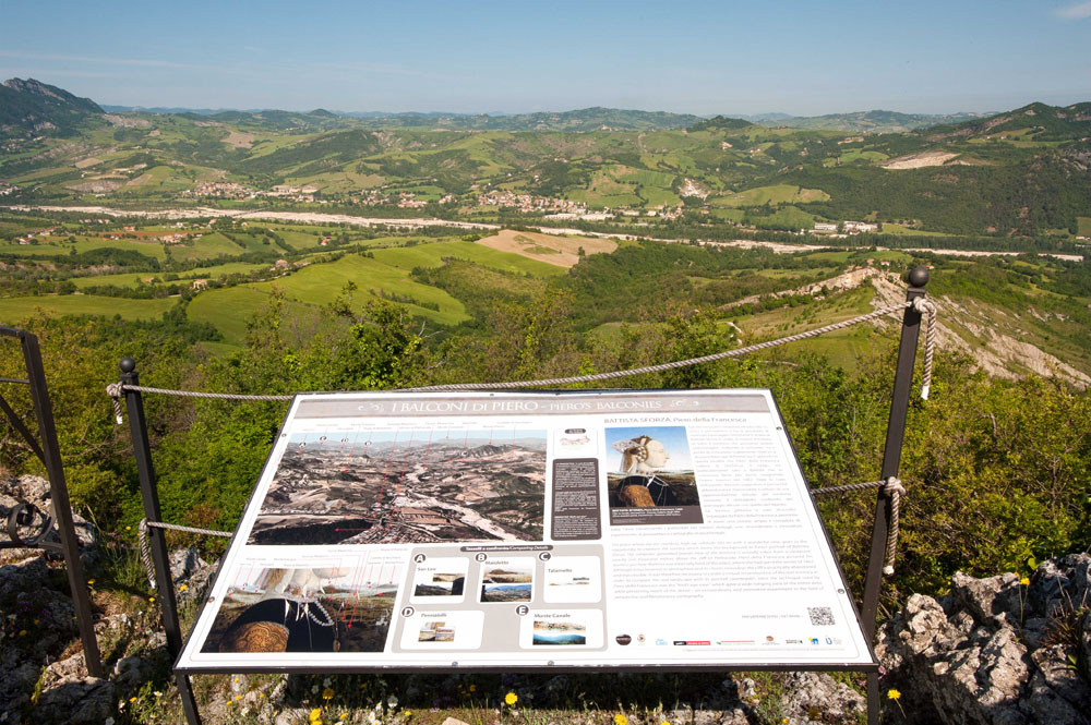 Come testardi ricercatori a caccia di immagini del Rinascimento, si seguono le curve dolci del paesaggio dai colori pastello del Montefeltro per giungere ai “balconi” che affacciano sulle colline raffigurate da Piero della Francesca nei paesaggi dei suoi capolavori. È proprio tra i poggi della val Marecchia e del Metauro, infatti, che sono state identificate le sinuose linee delle campagne che sfumano alle spalle del ritratto di Battista Sforza e fanno da sfondo al quadro di San Girolamo e ai Trionfi, tra le più note tele del grande pittore nato a Sansepolcro. A pochi chilometri dalla rupe di San Leo, dalle cui torri si apre una vista eccezionale sul Montefeltro, da piccoli balconi attrezzati si godono gli scorci che hanno ispirato Piero della Francesca.