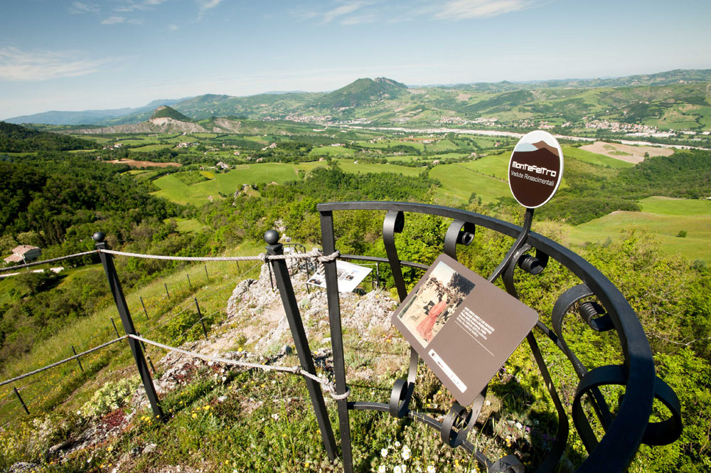 Uno dei più geniali pittori del Quattrocento, Piero della Francesca, ebbe fortuna e onori lavorando per molte famiglie regnanti dell’Italia Centrale. In varie occasioni, per raggiungere le ricche corti di Urbino e di Rimini dalla natia Borgo Sansepolcro, viaggiò insieme ai suoi assistenti lungo le valli del Metauro e del Marecchia sulle stesse strade che ancora oggi si possono percorrere, guardando gli stessi paesaggi. Lunghe ricerche hanno portato negli anni alla scoperta di ben sette vedute che Piero della Francesca aveva utilizzato come sfondo per alcune delle sue opere più celebri. Alcuni specchi d’acqua dipinti nel Quattrocento sono oggi scomparsi, ma le indagini geologiche testimoniano che erano certamente esistiti; colli e monti si sono modificati a causa di frane e smottamenti, però anch’essi sono stati “certificati” dagli studi scientifici sul suolo. Da questo lavoro è nata l’idea di Montefeltro Vedute Rinascimentali: un percorso suggestivo e una rete di luoghi storici, segnalati sul terreno da piccoli e simbolici balconcini in ferro battuto, dai quali si può entrare, senza temere di sbagliare, nel paesaggio idilliaco che fa da sfondo ai grandi del passato. Il punto migliore da cui partire, quasi al centro della ragnatela dei viaggi compiuti da Piero della Francesca, si trova all’ombra della ripida e severa Rocca di San Leo. A pochi passi da qui sono stati allestiti i balconi che portano nelle tele che ritraggono Battista Sforza e San Girolamo, due dei capolavori del pittore di Sansepolcro. Oggi come allora, è possibile lasciarsi affascinare dai dolci paesaggi del Montefeltro, confrontando la realtà con le opere d’arte e guardando il mondo con gli occhi dell’artista.