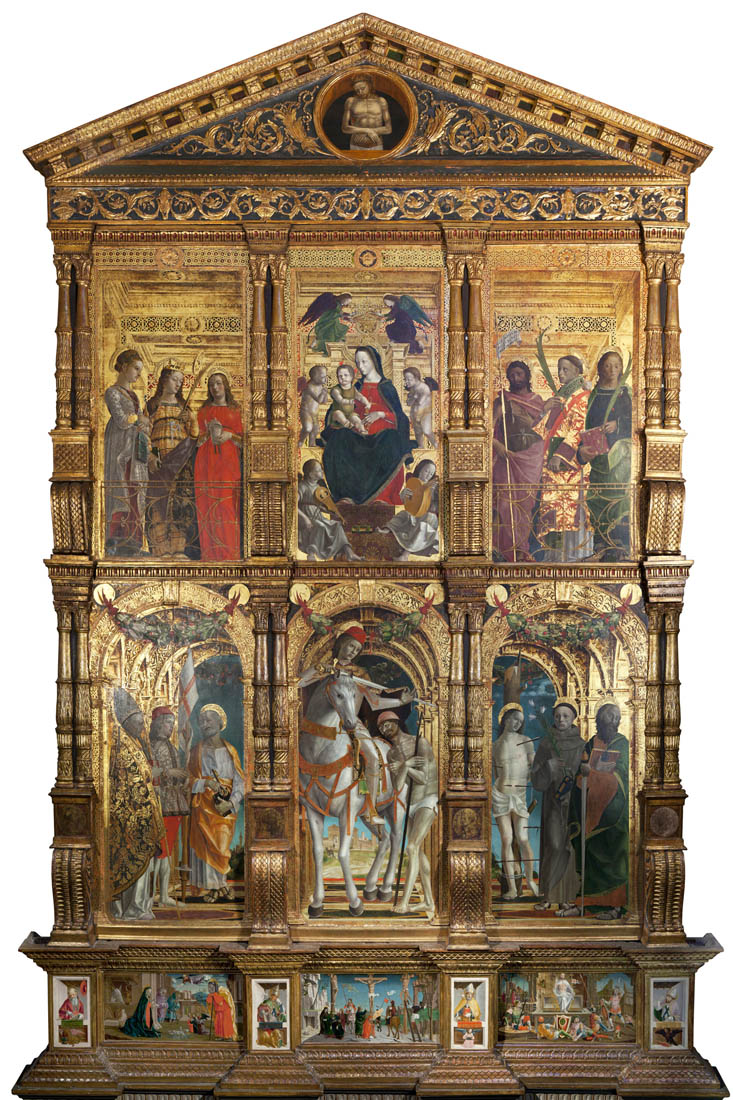 Ammirando il polittico di San Martino sembra quasi di poter “sbirciare” all’interno di un grandioso palazzo dalla facciata trasparente. Si ammirano la Madonna, San Martino, gli altri santi e gli angeli, disposti su un fondale carico di ori e preziosità, che i pittori Bernardo Zenale e Bernardino Butinone seppero però modernizzare grazie all’uso della prospettiva nelle arcate, nei soffitti e nei pavimenti. È come assistere al passaggio in Lombardia tra lo stile gotico internazionale, sfarzoso e raffinato, e l’affermazione del Rinascimento, dove è la misura a contare di più e dove sono centrali espressioni e fisionomie. Si va alla ricerca dei mille dettagli che rendono unico questo polittico: le stoffe damascate e ricamate degli abiti dei santi, impreziosite da perline; le acconciature e gli accessori; i frutti pendenti dei festoni, con uccellini che rendono vivace la scena. Ci si inoltra nel mistero delle storie sacre, ed ecco le tre sante sulla sinistra, abbigliate come principesse, che mostrano i simboli della loro fede: gli occhi per Lucia, la ruota dentata per Caterina, i sacri unguenti per la Maddalena. Altrettanto ricchi sono i paramenti dei santi sottostanti: in particolare Maurizio e Zeno, molto venerati a Treviglio, città di cui si riconosce il campanile nel paesaggio di sfondo. Nella splendida scena centrale con San Martino si avvertono infine tutta l’umanità del cavaliere e il freddo patito dal povero.