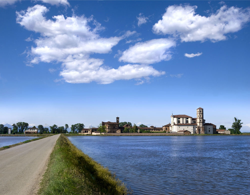 Nella tarda primavera, quando la fertile pianura vercellese distesa tra il Ticino, la Dora Baltea e il Sesia è inondata dall’acqua, le risaie si trasformano in lucenti specchi a quadretti che riflettono le nubi e gli incantevoli colori del tramonto. Al sopraggiungere dell’estate l’azzurro declina verso il verde tenero delle piantine di riso al primo germoglio, fino ad assumere a settembre la tonalità giallo intenso delle spighe mature. A trasformare nel Medioevo le foreste acquitrinose del Vercellese in fertili campagne furono i Benedettini e i Cistercensi, che qui introdussero l’agricoltura insieme con le slanciate linee gotiche dell’architettura d’Oltralpe. Tracce del gotico si scoprono nel borgo di Quinto Vercellese, celate tra le calde pareti in mattoni della parrocchiale dei Santi Nazario e Celso, che racchiudono una leggiadra navata gotica a due arcate ricoperta di affreschi. A Vercelli, costruita secondo la leggenda sopra una palude, il gotico assume invece il volto delle torri nobiliari dei Vialardi, dei Tizzoni e dell’Angelo, che svettano sui rossi tetti della città come missili medievali in viaggio verso lo spazio. La maestosa basilica di Sant’Andrea, costruita tra il 1219 e il 1227, assume ancor più il volto di uno stupefacente trattato a cielo aperto dimostrando come il gotico francese abbia potuto innalzare e alleggerire la solida architettura romanica di ambiente lombardo-emiliano. Usciti dalla città, tra i riflessi blu e grigi dell’acqua, si scorge all’orizzonte un’isola di terraferma che la cartina indica come Principato di Lucedio. Qui i monaci cistercensi a partire dal XII secolo fondarono un monastero che ancora oggi conserva le originarie linee gotico-lombarde, coniugando la spiritualità con il fervore delle opere.
